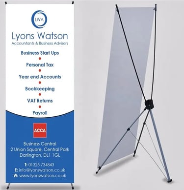 X-bannery – ľahké, prenosné a rýchlo zostaviteľné stojany v tvare X, ideálne pre časté prenášanie a rýchlu inštaláciu. Dostupné v rôznych veľkostiach, vrátane mini verzií pre recepcie a pulty.